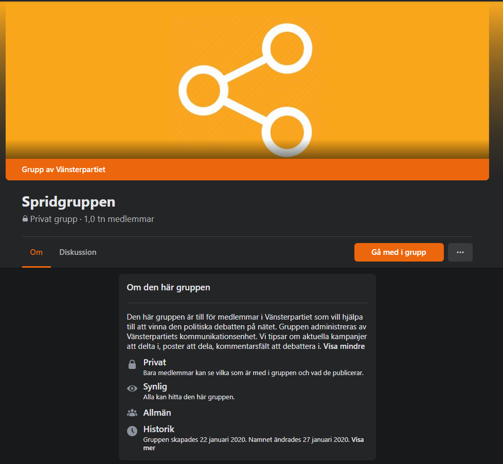 Gruppen ”Spridgruppen” på Facebook är till för medlemmar i Vänsterpartiet som vill hjälpa till att vinna den politiska debatten på nätet. Gruppen administreras av Vänsterpartiets kommunikationsenhet…